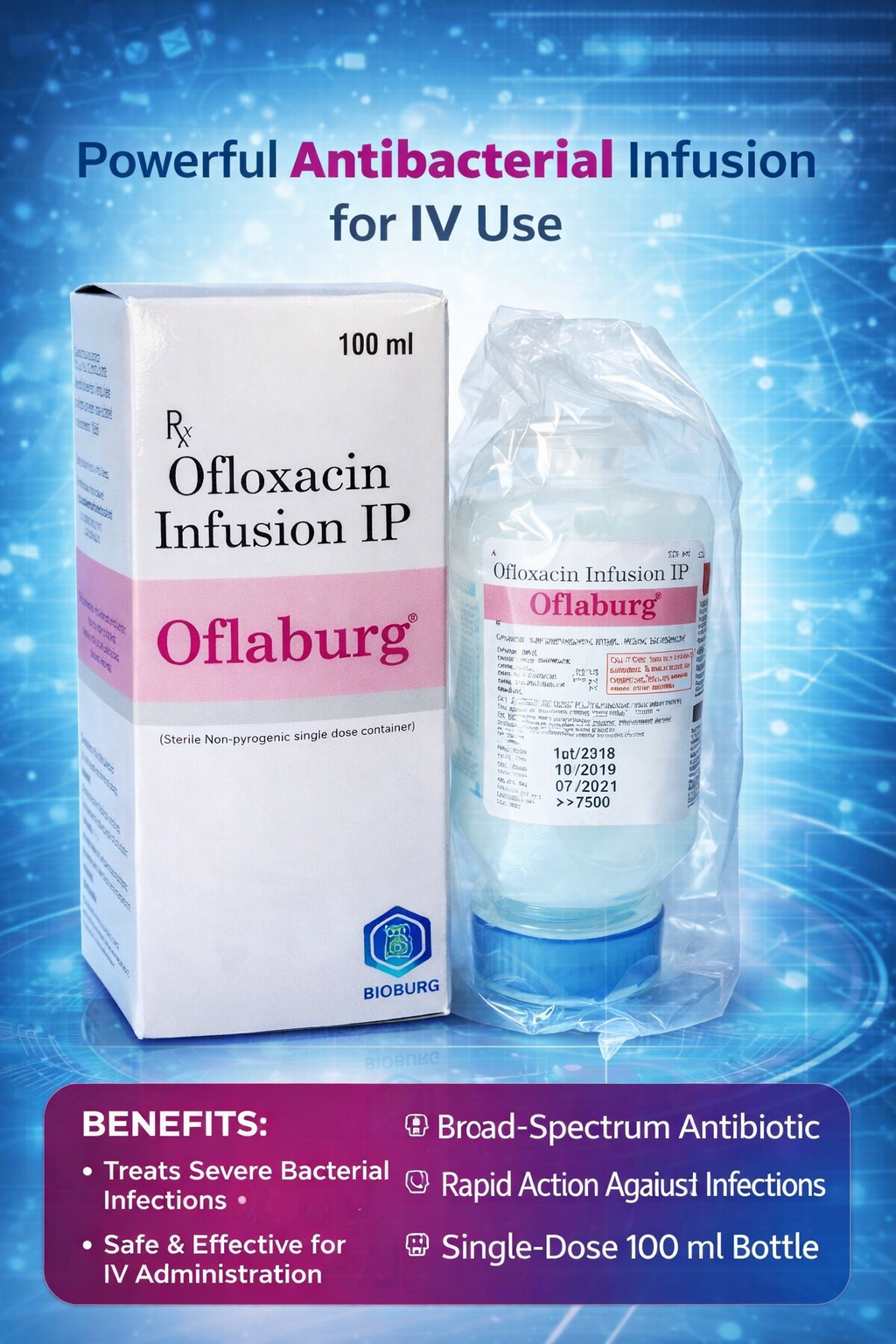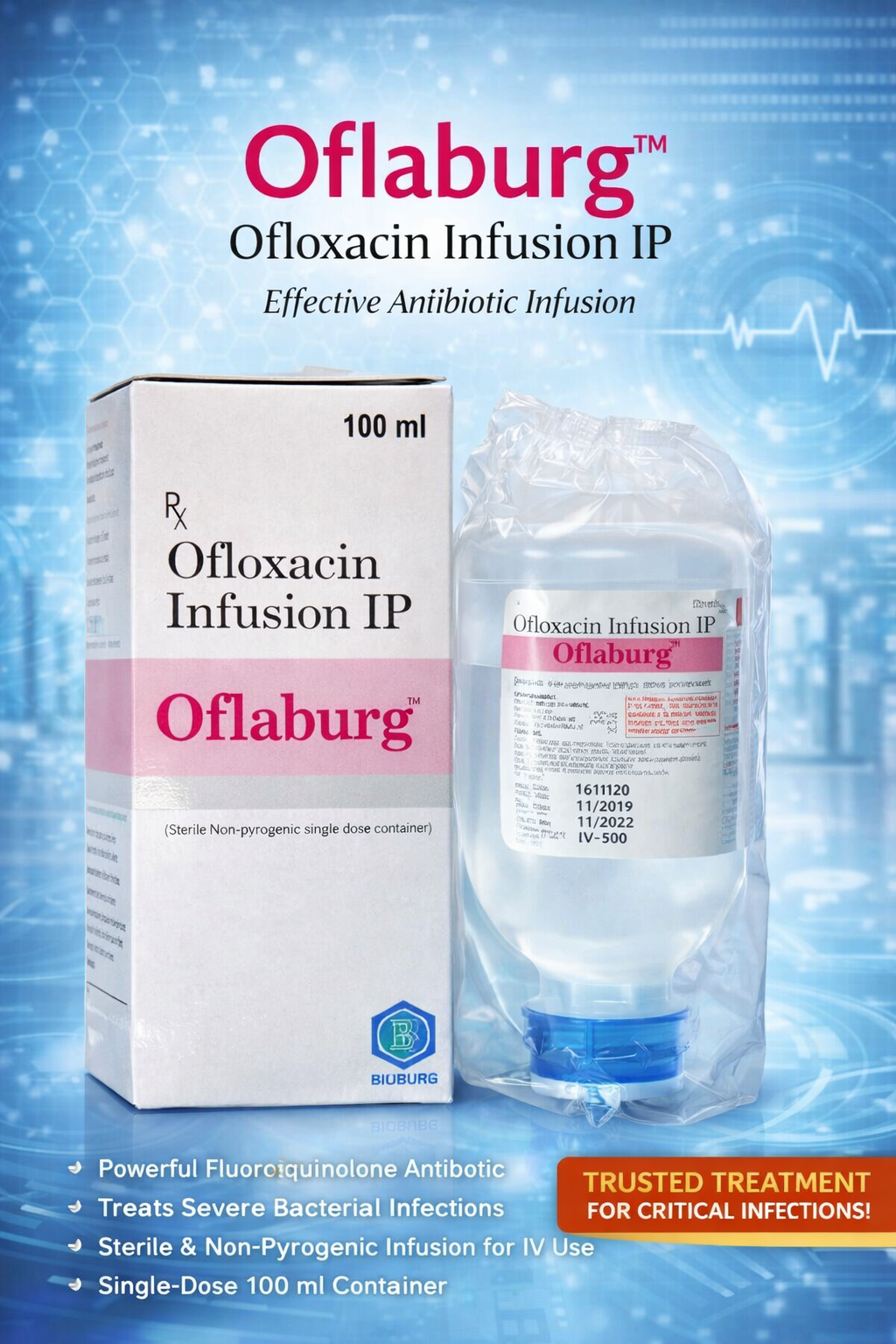 Oflaburg IV Infusion is an antibiotic medicine that can be used to treat many different infections caused by bacteria. It stops the growth of the bacteria causing the infection and clears the infection. Take it for as long as prescribed by the doctor and avoid skipping doses. This will make sure that all bacteria are killed and they do not become resistant.